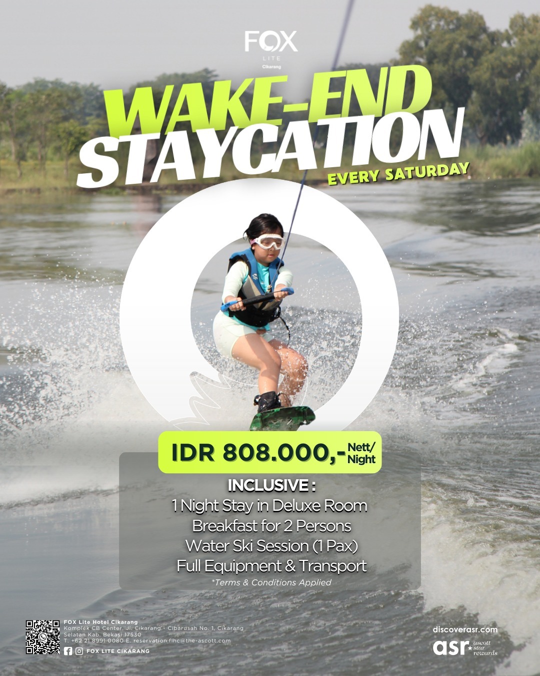 Paket Wake-End Staycation hadir setiap hari Sabtu, menawarkan kesempatan bagi tamu untuk menikmati fasilitas hotel sekaligus merasakan sensasi memacu adrenalin dengan berselancar di atas air. Dengan konsep inovatif ini, FOX Lite Hotel Cikarang menjadi pionir dalam menghadirkan pengalaman menginap yang berbeda di kawasan ini.
